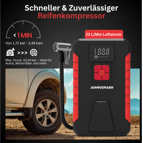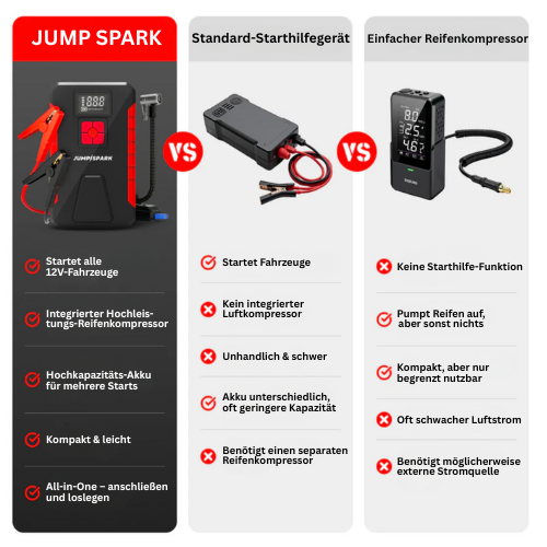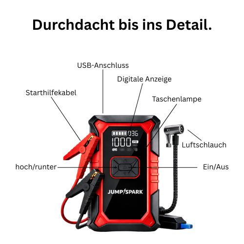 Unser JumpSpark kann eine typische Autobatterie mit einer vollständigen Ladung bis zu 40–50 Mal überbrücken, abhängig von der Motorgröße des Fahrzeugs und dem Zustand der Batterie.